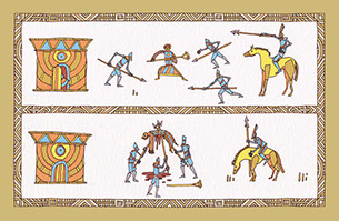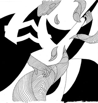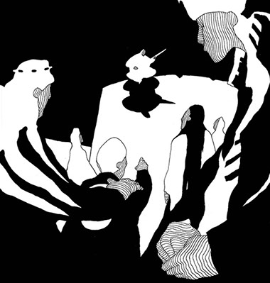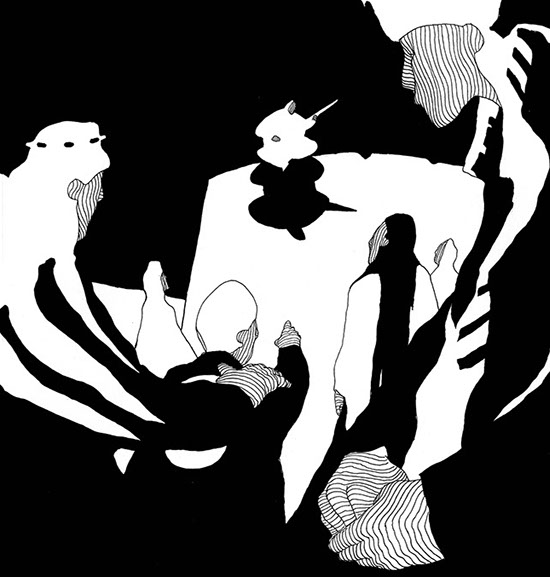 Livre jeunesse autour d’un peuple nomade qui vit d’art et de musique. noir et blanc 4 pages. 21cm x 21cm Encres de chine. Janvier 2017.