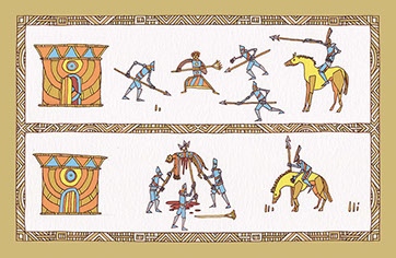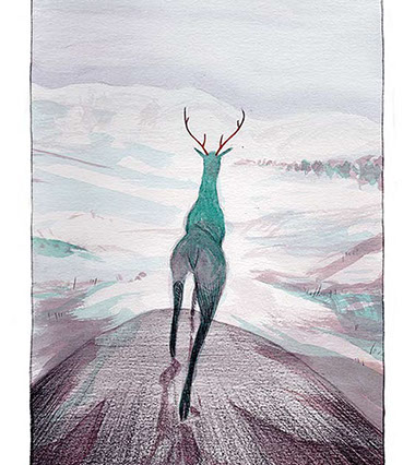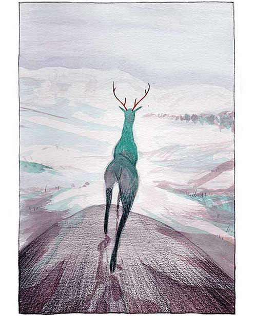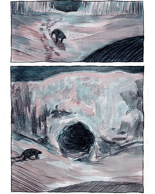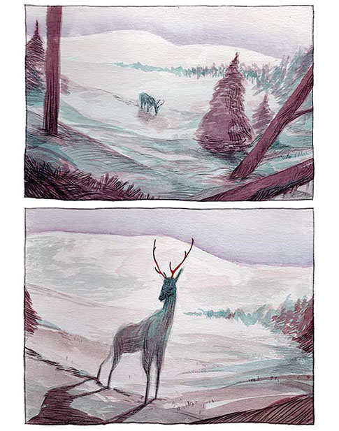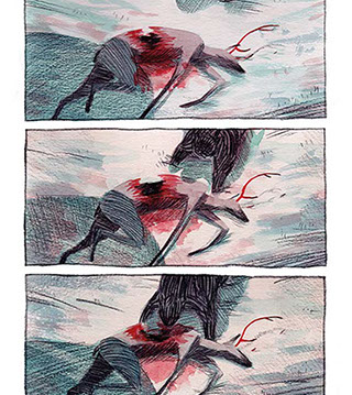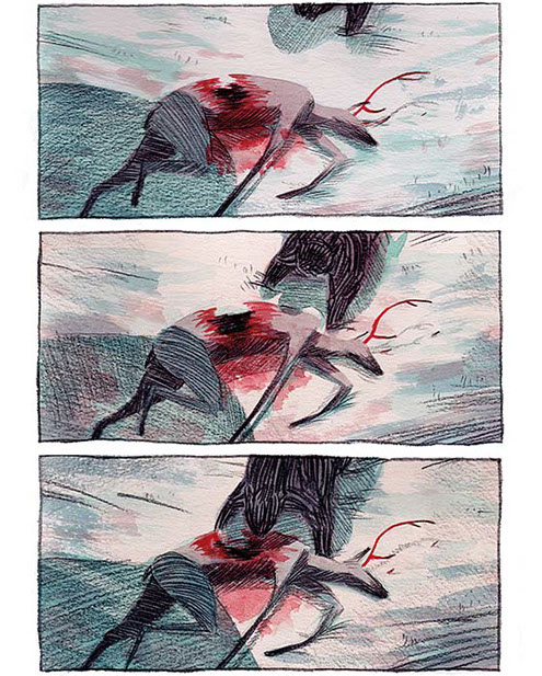 • Bande dessinée sur une bête et son petit, pourchassés par des chasseurs. 10 pages. 19.5 cm x 13.5 cm. Gouaches et crayons de couleur. Novembre 2016