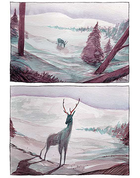 Bande dessinée sur une bête et son petit, pourchassés par des chasseurs. 10 pages. 19.5 cm x 13.5 cm. Gouaches et crayons de couleur. Novembre 2016